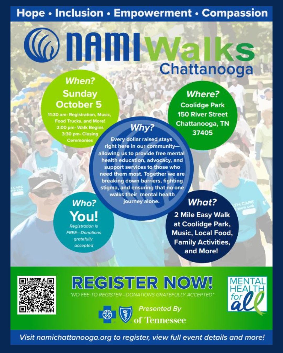 To register, go to NAMIWalks.org/Chattanooga. From there, select "Register," which will prompt you to create an account. After your account is created, you will see the option to "Join a Team." Look for CANAP and join us!